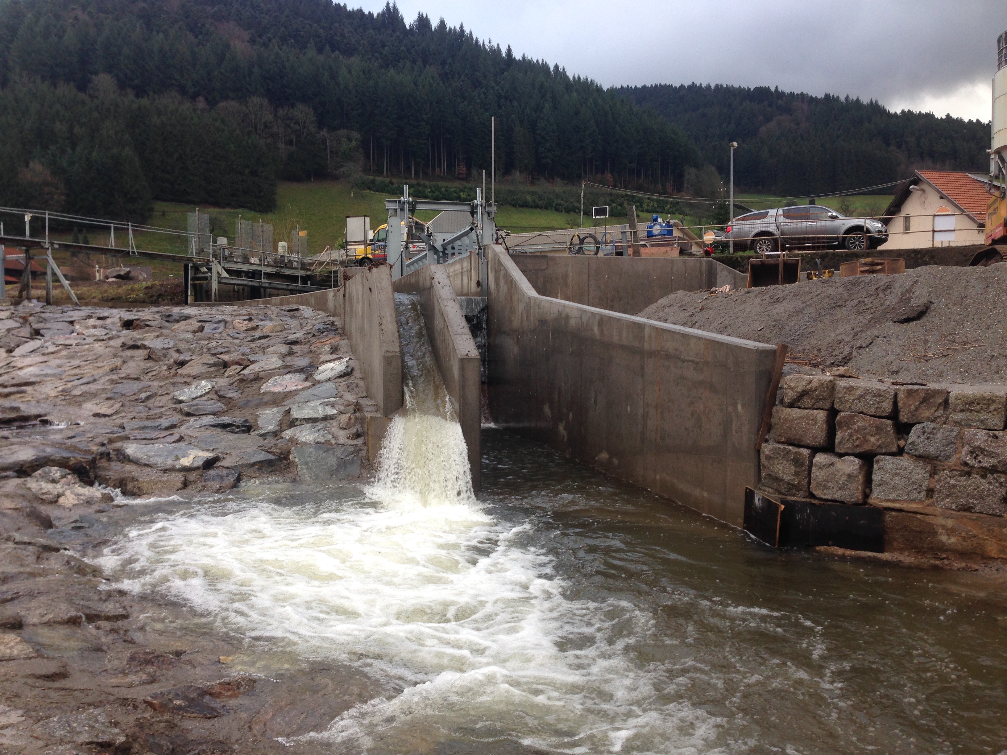 Das Fischabstiegssystem mit Abstiegskorridor und festem Bremswehr wird mit einer Wassermenge von 500 l/s betrieben. Die Abflusskontrolle bzw. Regulierung der zuströmenden Betriebswassermenge erfolgt durch die Überströmung des festen Bremswehres. Die lichte Breite des Abstiegskorridors beträgt 0,60 m. Die Wassertiefen variieren zwischen 0,60 bis 2,20 m. Die Fließgeschwindigkeiten liegen am Einstieg bei ca. 0,5 m/s und steigen bis zur Oberkante des festen Bremswehres bis auf ca. 1,4 m/s an. Die Anströmseite des Bremswehres ist mit einem Anstiegswinkel von max. 15,0° ausgeführt, der Abströmbereich mit einem Winkel von ca. 25° geneigt. Bei dieser Ausführung des Fischabstiegssystems kann durch die Trennung der Korridore für Rechengutweitergabe und Fischabstieg am Eintrittsquerschnitt des Fischabstieges auf eine bewegliche Konstruktion verzichtet werden.